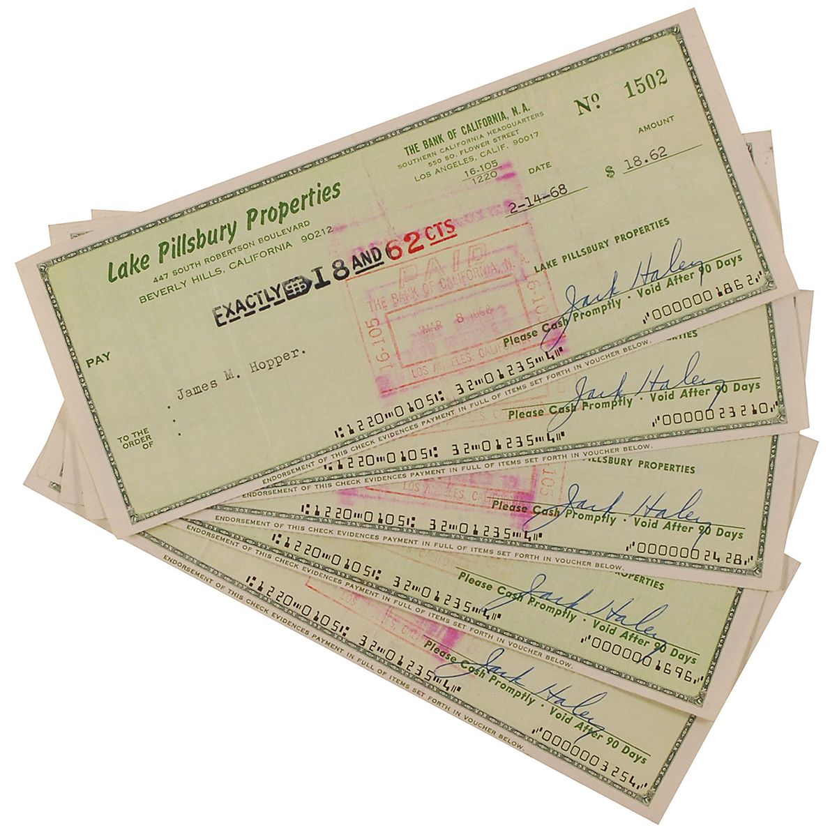Five Lake Pillsbury Properties business checks from 1967 and 1968, 8.5 x 3.5, all filled out in type and signed by Haley, “Jack Haley.” Expected vertical folds and bank stamps, some slightly affecting signatures, otherwise fine condition.