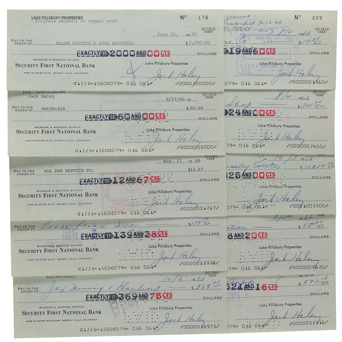 Ten Lake Pillsbury Properties checks, 8 x 3, three filled out in type and signed by Haley, two filled out in another hand and signed by Haley, and five filled out and signed by Haley, all from 1966. In very good to fine condition, with expected stamps and cancellation holes, as well as folds to a couple of checks.