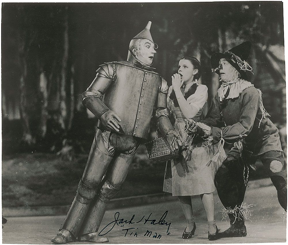 Glossy 8.25 x 7 photo of the Tin Man, Scarecrow, and Dorothy, signed in black felt tip, “Jack Haley, ‘Tin Man.’” In very good condition, with trimmed edges and scattered creases.