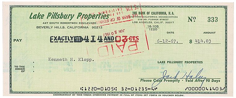 Business check, 8.5 x 3.5, filled out in type and signed by Haley, payable to Kenneth H. Klopp for $414.03, June 12, 1967. In fine condition, with expected cancellation stamp.