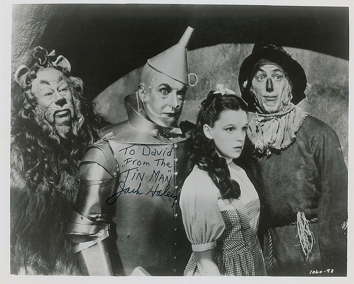 Glossy 10 x 8 photo of Haley in costume as the Tin Man alongside Dorothy, the Scarecrow, and the Cowardly Lion, signed and inscribed in black felt tip, “To David from the ‘Tin Man,’ Jack Haley.” In fine condition, with a couple slight surface creases.
