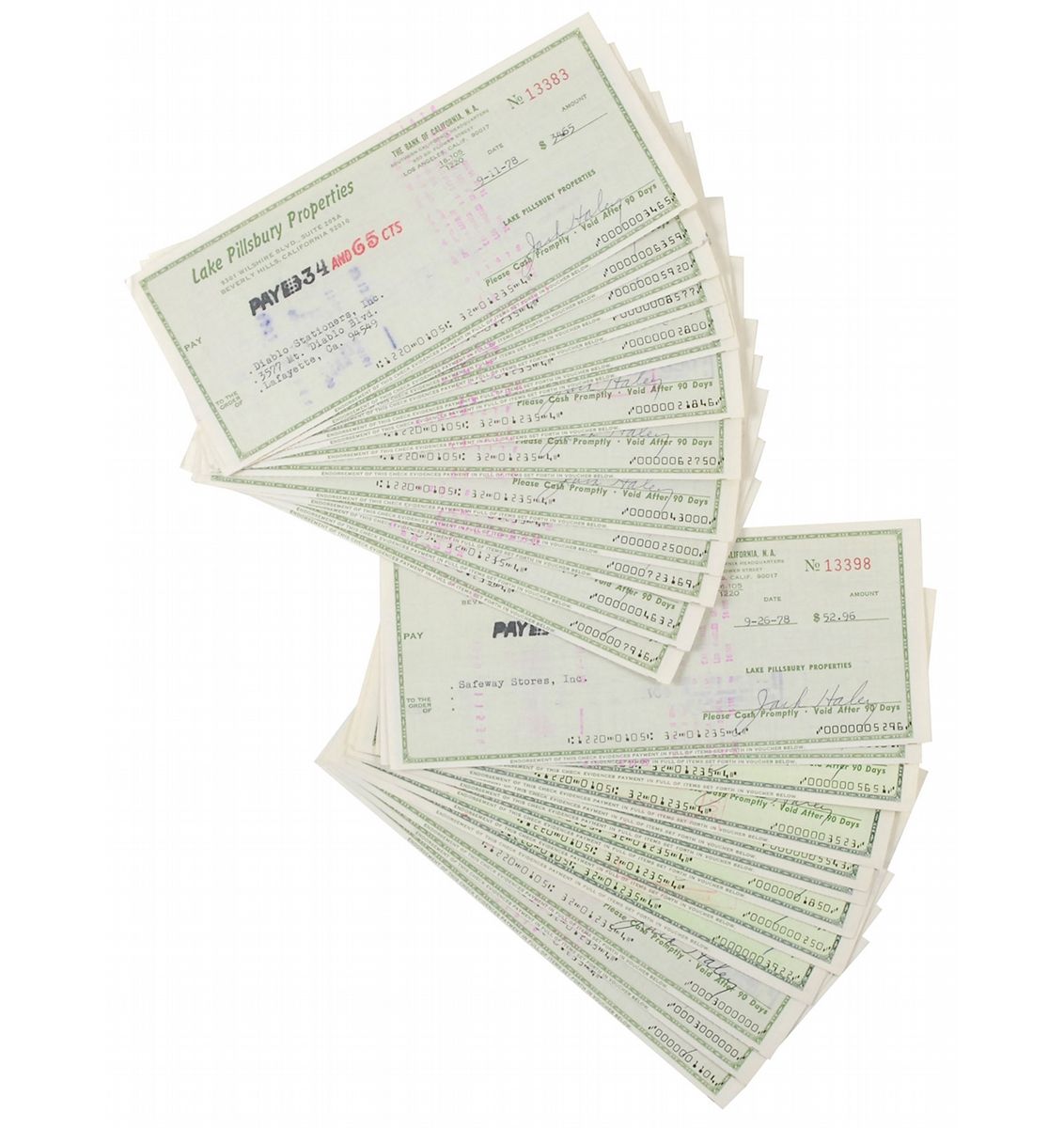 Collection of 25 Lake Pillsbury Properties business checks, 8.5 x 3.5, dated between 1968 and 1978, each signed “Jack Haley.” In overall fine condition, with expected bank stamps and notations.