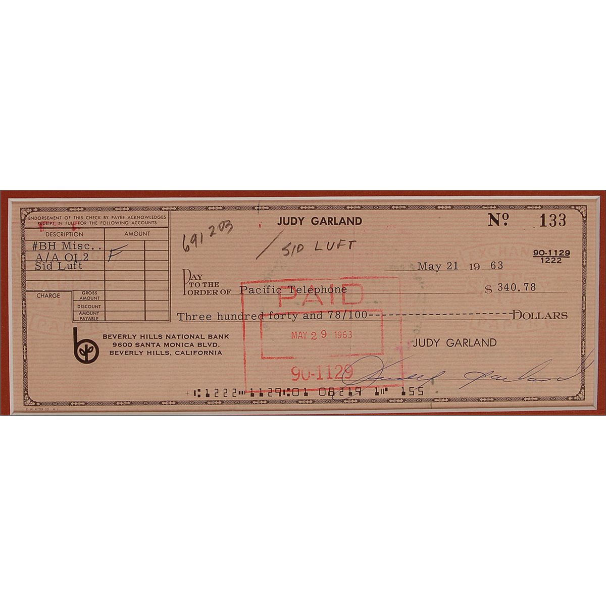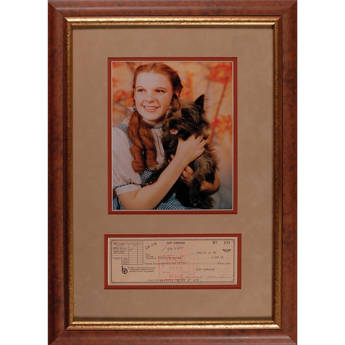 Personal check, 8 x 3, filled out in type and signed by Garland, payable to Pacific Telephone for $340.78, May 21, 1963. Double-suede matted and framed, with a fantastic color image of Garland as Dorothy, to an overall size of 16.25 x 22.5. In very good condition, with a central vertical fold, pencil notations, and the expected cancellation notations and stamps, the latter lightly affecting the first half of the signature.