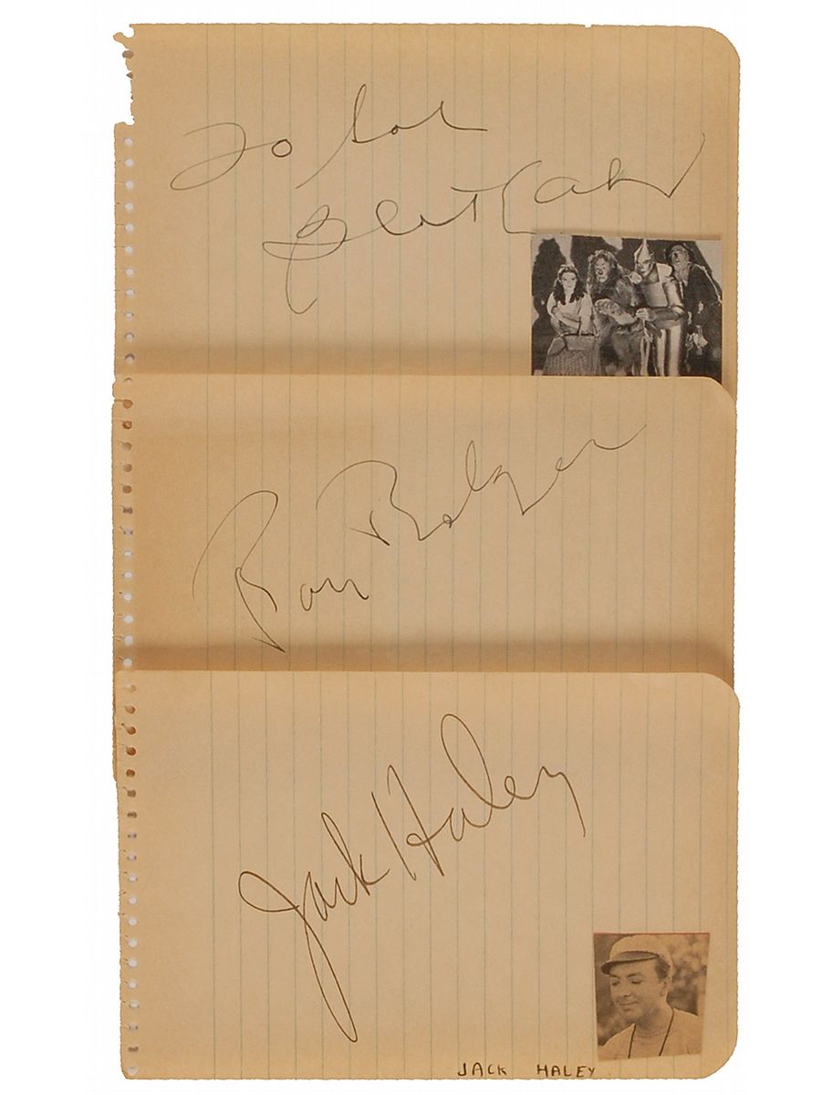 Three vintage fountain pen signatures, “To Lou, Bert Lahr,” “Ray Bolger,” and “Jack Haley,” on individual off-white 5.75 x 3.75 lined album pages, each with collector’s notations to the bottom and two with affixed newspaper photos. Scattered toning, other