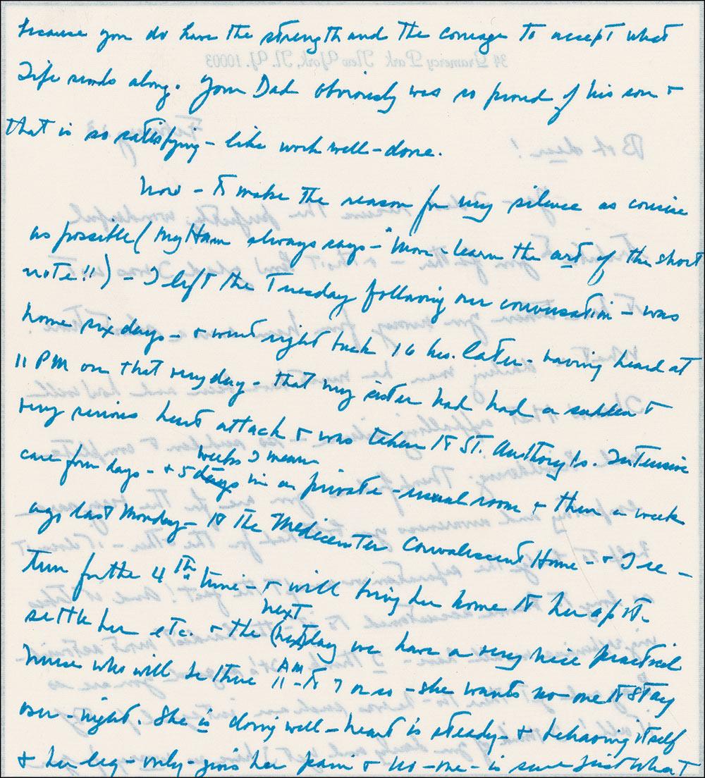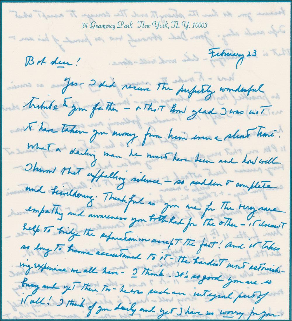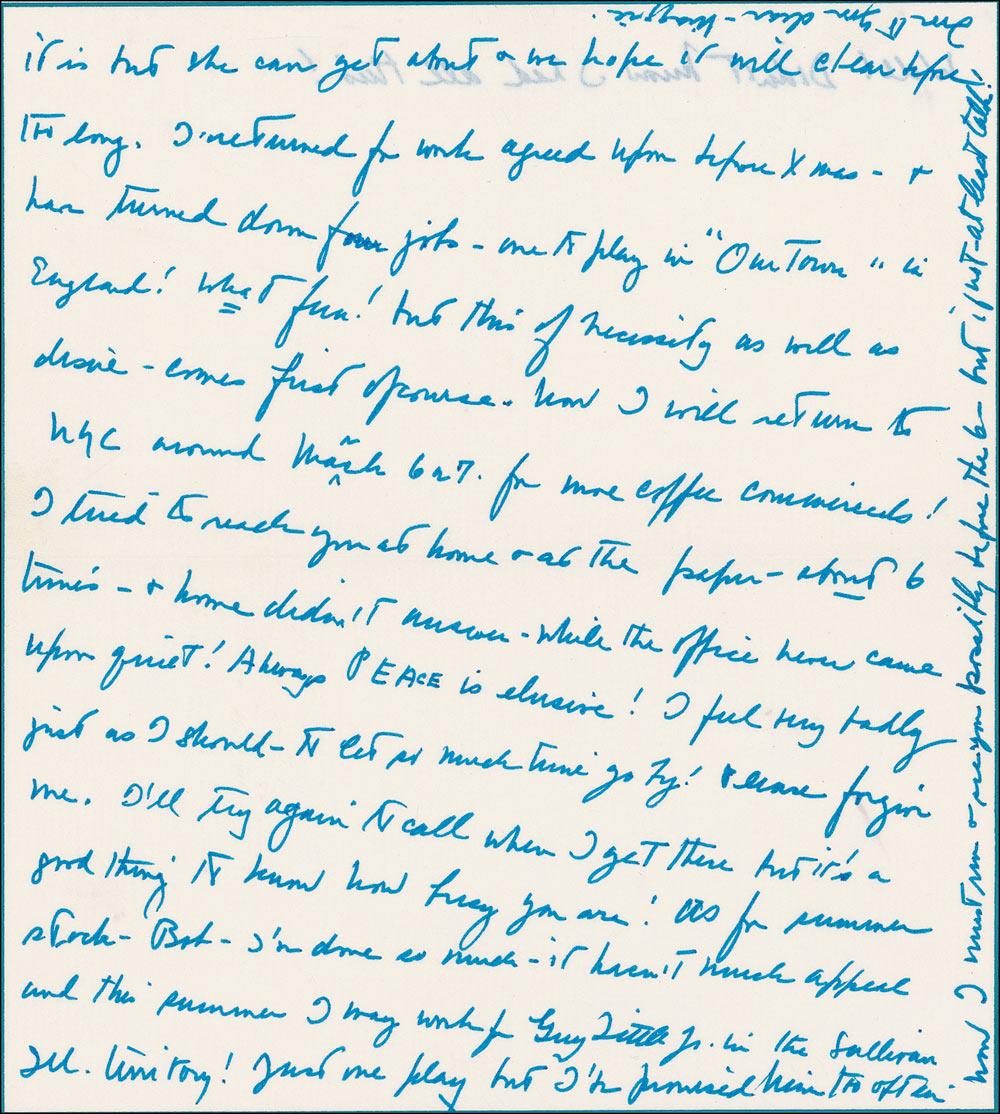 ALS signed “Maggie,” two pages both sides, 6.75 x 7.5, personal letterhead, February 23, 1973. Letter to theater critic Robert E. White, Jr. In part, regarding the passing of an acquaintance as well as the health of her sister, who suffered a recent heart attack. She also writes of her current work status. In part: “I returned for work agreed upon before Xmas-& have turned down four jobs-one to play in ‘Our Town’ in England! What fun! But this of necessity as well as desire-come first of course. Now I will return to NYC around March 6 or 7 for more coffee commercials! I tried to reach you at home or at the paper-about 6 times-& home didn’t answer - While the office never came upon quiet! Always Peace is so elusive!” In fine condition. Accompanied by the original mailing envelope, addressed in Hamilton’s hand, as well as a second letter from a gentleman to White, enclosing a color candid snapshot of White and Hamilton.