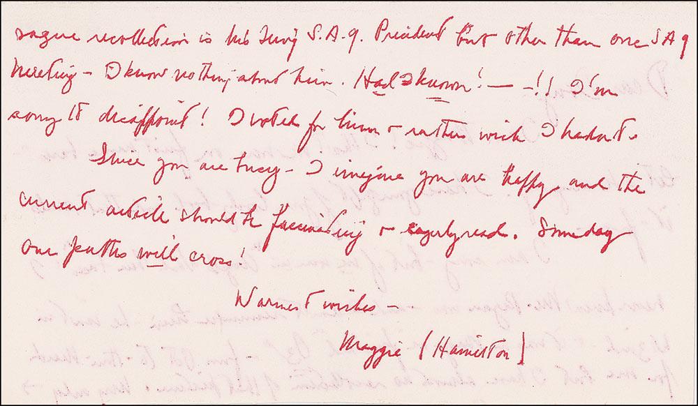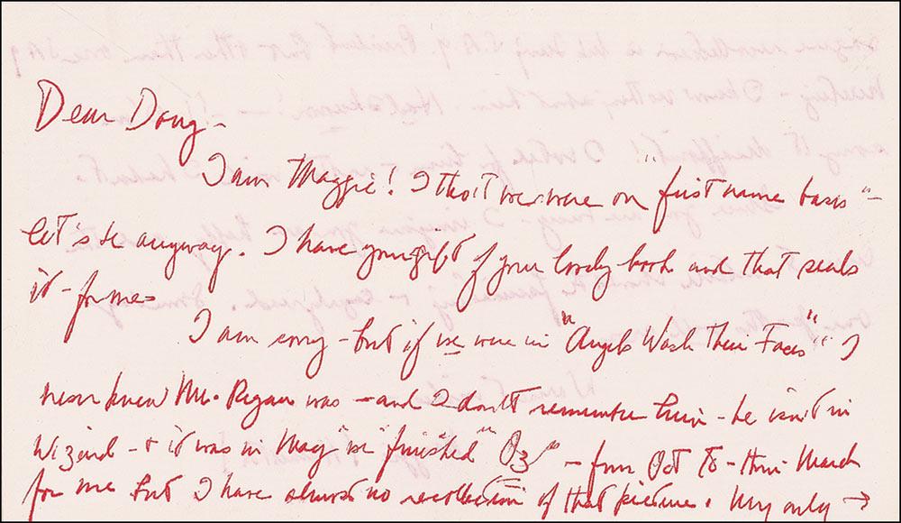 ALS signed “Maggie (Hamilton),” one page both sides, 5.75 x 3.5, no date. Letter to Doug McClelland. In part: “I am Maggie! I thought we were on a first name basis - let’s be anyway…I am sorry but if we were in ‘Angels Wash Their Faces’ I never knew Mr. Regan was-and I don’t remember him-he isn’t in Wizard & it was in May ‘we finished; Oz-from Oct. thru March for me but I have no recollection of that picture.” In fine condition. Accompanied by the original mailing envelope addressed in Hamilton’s hand.
