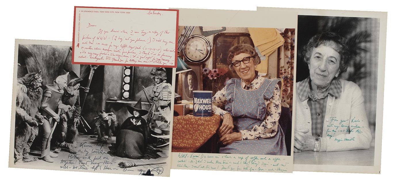 Four items: glossy 10 x 8 photo from the Wizard of Oz showing the melting Wicked Witch, inscribed in black felt tip, “Kevin—help! A big towel or blotter would put me together. But hurry there will—no time left! Here I go. Bye” and adding drawing of a witch’s cap; color satin-finish 8 x 10 glossy photo of Hamilton as Maxwell House spokeswoman ‘Cora’ signed and inscribed in green ink “Maggie”; glossy 8.25 x 10.5 publicity photo, signed and inscribed in green ink “Maggie Hamilton”; and an undated ALS. In overall very good condition.