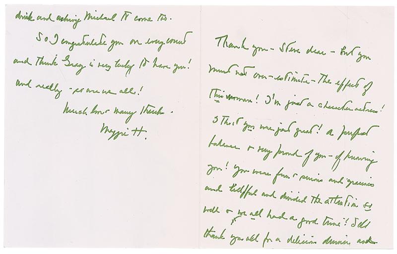 ALS signed “Maggie H.,” on two adjoining sheets of a greeting card, 4 x 5, no date, but postmarked September 8, 1978. Letter to Steve Forrest who included her in a special Television Academy dinner which honored her for her work as an actress. In part: “Thank you–Steve-dear but you must not over-estimate the effects of this woman! I’m just a character actress! I thought you were just great!…You were fun & serious and gracious and helpful and divided the attention so well we all had a good time…Thank you for a delicious dinner and drink and asking Michael to come too.” Vertical crease to a single side of each page and a few wrinkles, otherwise fine condition.