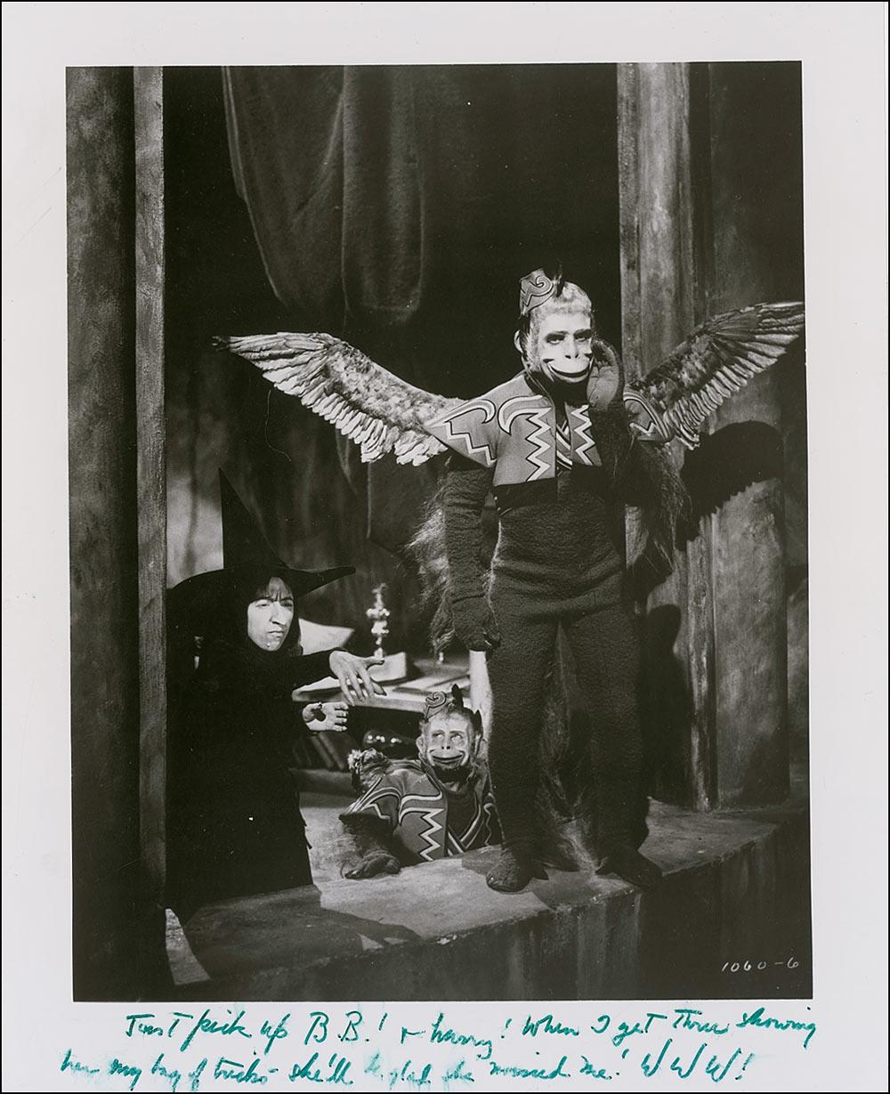 Glossy 8.25 x 10 photo of the Wicked Witch and her flying monkeys, signed and inscribed in green felt tip “Just pick up B.B.! & hurry! When I get thru showing her my bag of tricks—she’ll be glad she missed me! WWW!” In very good condition, with some surface impressions and smearing of a few words from Hamilton touching the still-wet ink. Accompanied by two unsigned scenes from the movie.