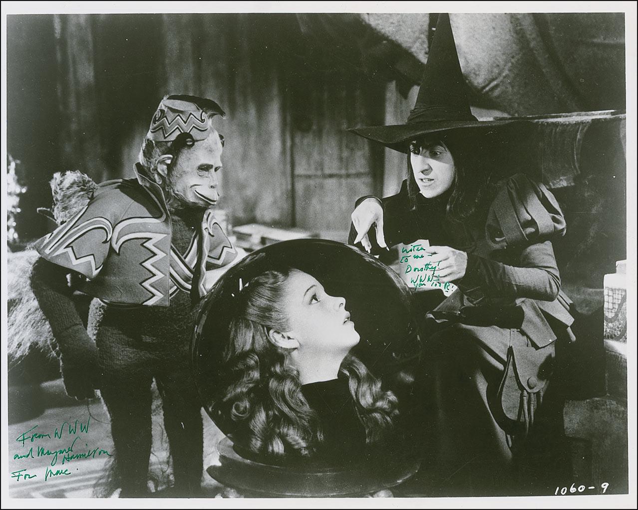 Glossy 10 x 8 photo of the Wicked Witch gazing at Dorothy in her crystal ball, signed and inscribed in green felt tip “From WWW and Margaret Hamilton for Marc,” adding “Listen to me Dorothy! You too R!” In fine condition, with a few scattered light creases and surface marks.