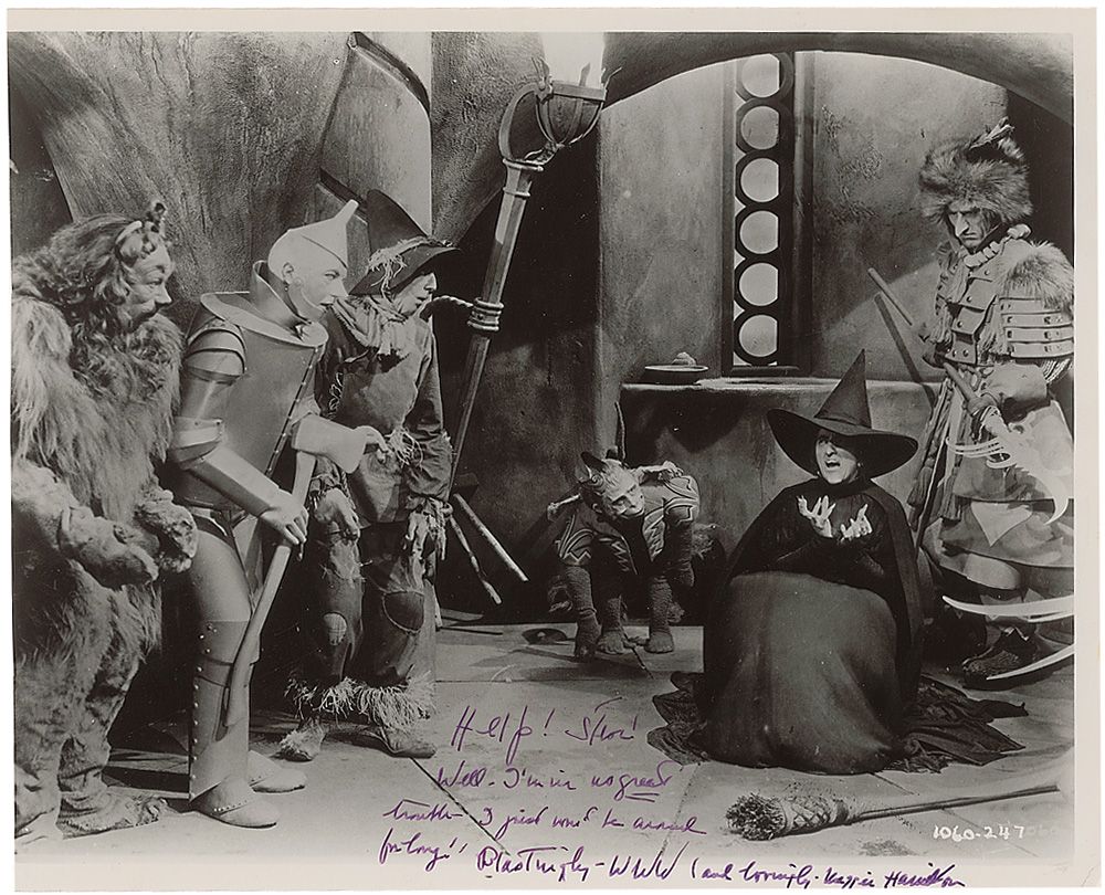 Glossy 9.75 x 8 photo of Hamilton in The Wizard of Oz, signed and inscribed in purple felt tip “Help! Steve! Well, I’m in no great trouble—I just won’t be around for long!—Blastingly—WWW (and lovingly)—Maggie Hamilton.” In fine condition, with a few scattered creases and a lightly trimmed left edge.