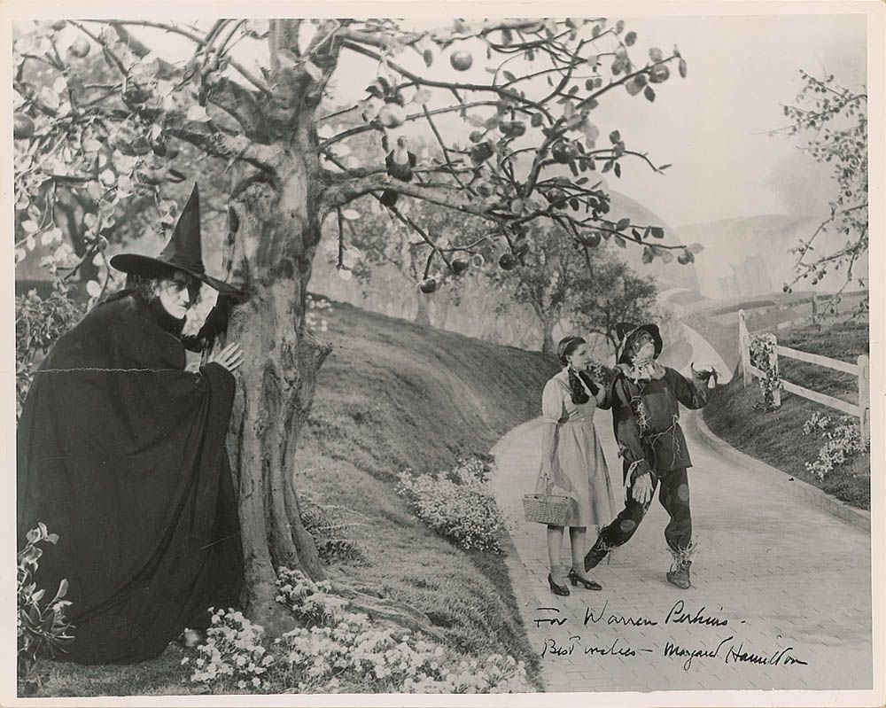 Semi-glossy 10 x 8 cardstock photo of the Wicked Witch hiding from Dorothy and the Scarecrow, signed and inscribed in black felt tip “For Warren Perkins—Best wishes—Margaret Hamilton.” In very good condition, with a noticeable crease to the left side, light creases and cracks to the emulsion to the lower right, and slight irregular adhesion to the inscription and signature.