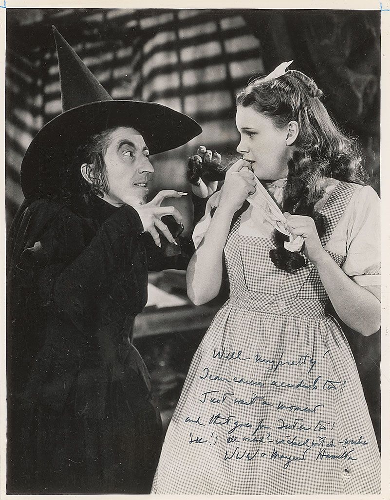 Glossy 7.75 x 10 United Press International photo, signed and inscribed in black ink, “Well my pretty! I can cause accidents too! Just wait a moment and that goes for Lester too! See!?…Wicked witch-wishes, WWW & Margaret Hamilton.” A promotional caption is taped to the reverse. In fine condition, with two light crop marks to top corner tips and a few light bends.