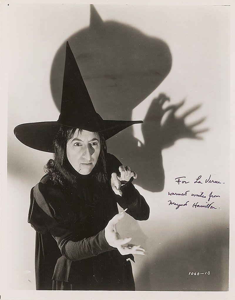 Menacing glossy 8 x 10 photo, signed and inscribed in black felt tip, “For La Vern, warmest wishes from Margaret Hamilton.” In fine condition.