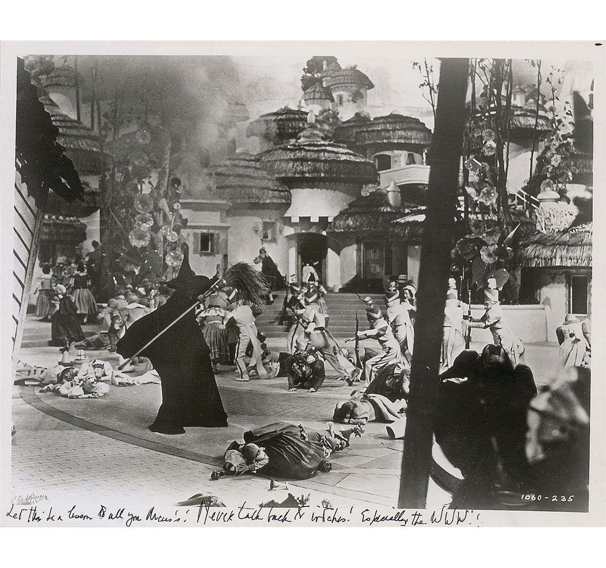 Glossy 10 x 8 photo of the Wicked Witch’s arrival in Munchkinland, signed and inscribed in the lower border in black ink, “Let this be a lesson to all you Arcus’s! Never talk back to Witches! Especially the WWW!” In fine condition, with a couple of minor corner tip dings.