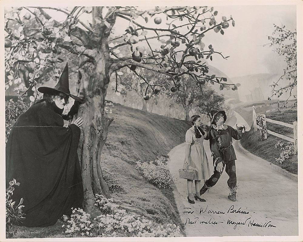 Vintage semi-glossy 10 x 8 cardstock photo of the Wicked Witch hiding from Dorothy and the Scarecrow, signed and inscribed in black ink, “For Warren Perkins—Best wishes—Margaret Hamilton.” In very good to fine condition, with a noticeable crease to the left side, light creases and cracks to the emulsion to the lower right, and slight irregular adhesion to the inscription and signature.