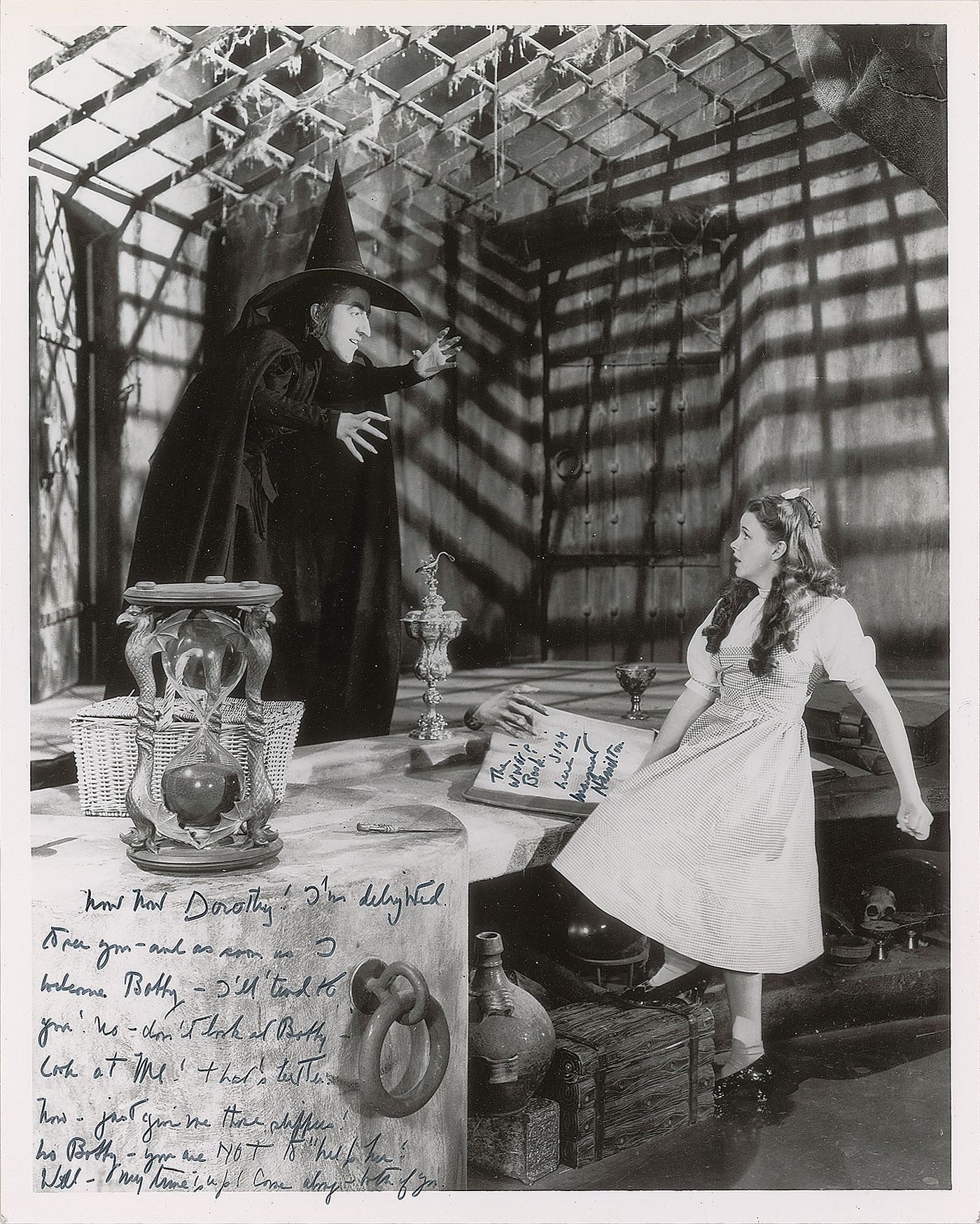 Wonderful glossy 8 x 10 photo of the Wicked Witch threatening the captured Dorothy, signed and inscribed in thin black felt tip, "Now now Dorothy! I'm delighted to see you—and as soon as I welcome Bobby—I'll tend to you! No—don't look at Bobby—look at me! That's better. Now—just give me those slippers! No Bobby—you are not to help her! Well—my time is up! Come along—both of you," adding in the book pictured on the table, "The WWW's Book, sign here—Margaret Hamilton.” In fine condition. While Hamilton was known for funny inscriptions on Wizard of Oz photographs, this is definitely a very special example.