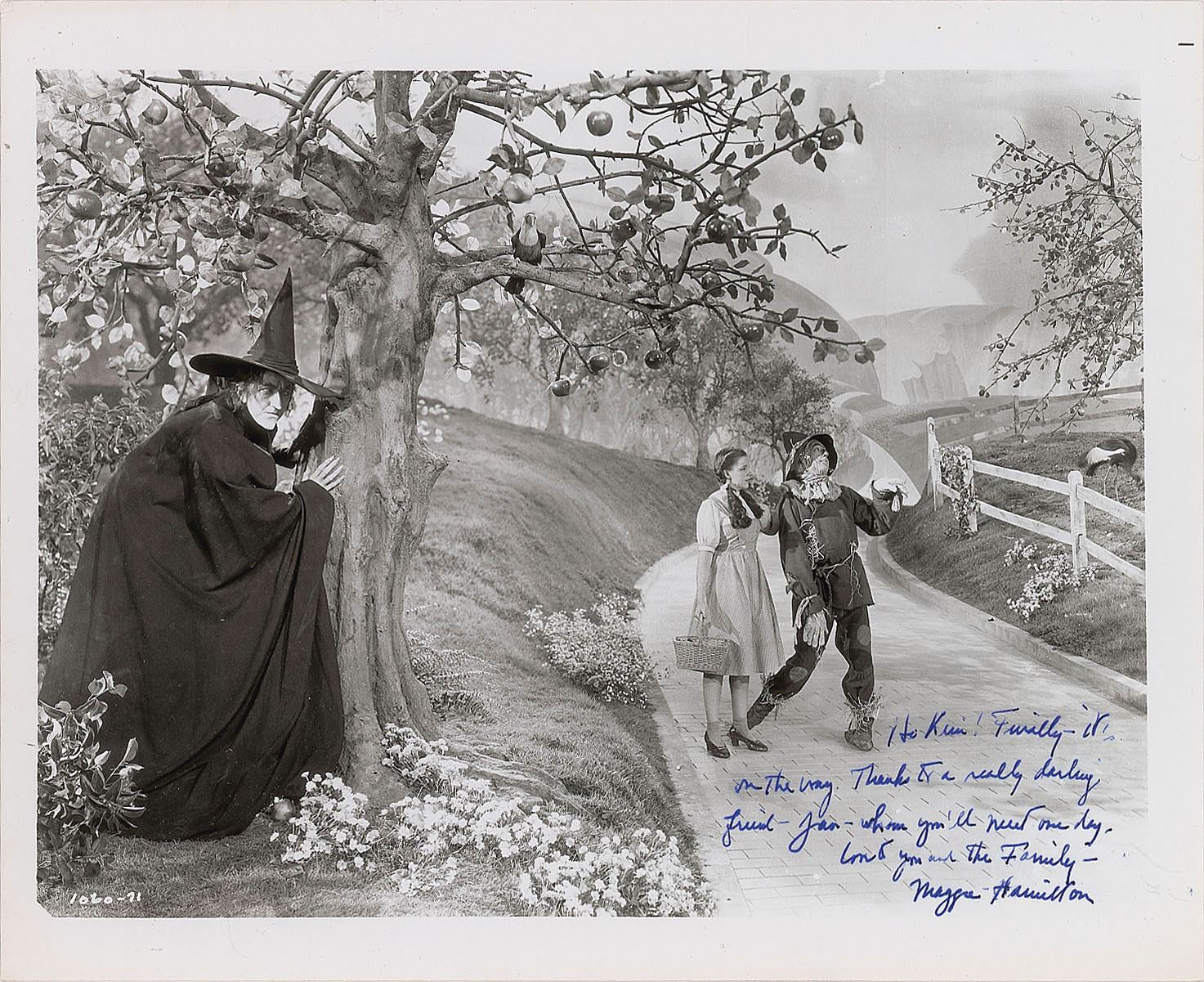 Glossy 10 x 8.25 photo of the Wicked Witch of the West spying on Dorothy and the Scarecrow as they walk down the yellow brick road, signed and inscribed in blue ink, "Hi Kim! Finally—it's on the way. Thanks to a really darling friend—Jan—whom you'll meet one day. Love to you and the family—Maggie Hamilton.” In fine condition, with scattered light creasing.