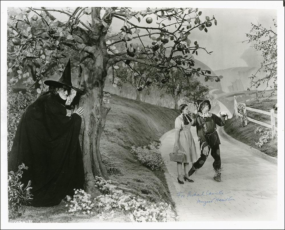 Glossy 10 x 8 photo of the Wicked Witch hiding from Dorothy and the Scarecrow, signed and inscribed in blue ballpoint “For Richard Cancilla—Margaret Hamilton.” In fine condition, with a couple small creases to lower left corner.