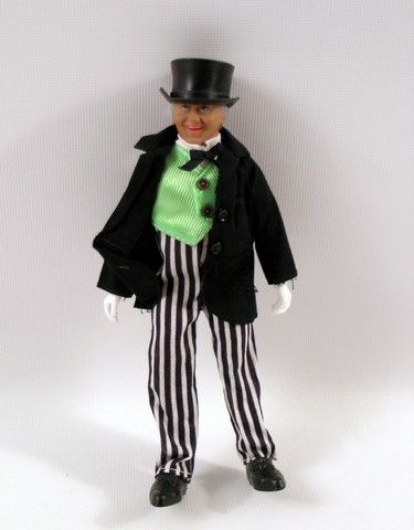Wizard of Oz Mego Limited Edition Wizard 1974 - Mego Toy Company was famous in the 1970's for their "Star Trek" series of dolls, as well as their Marvel & DC Superheroes. One of the top sellers was a series of "Wizard of Oz" dolls. Most were available in stores, but a few Limited Edition characters could only be bought through a special mail order promotion in 1974. This is one of those special rare mail-in dolls. It is of the "Wizard" himself, dressed in pin-stripped pants, tux-long coat jacket, Emerald Green Vest, tie, and separate top-hat. In Mint condition the Wizard is sold by itself without original box. (Approx 9" high).