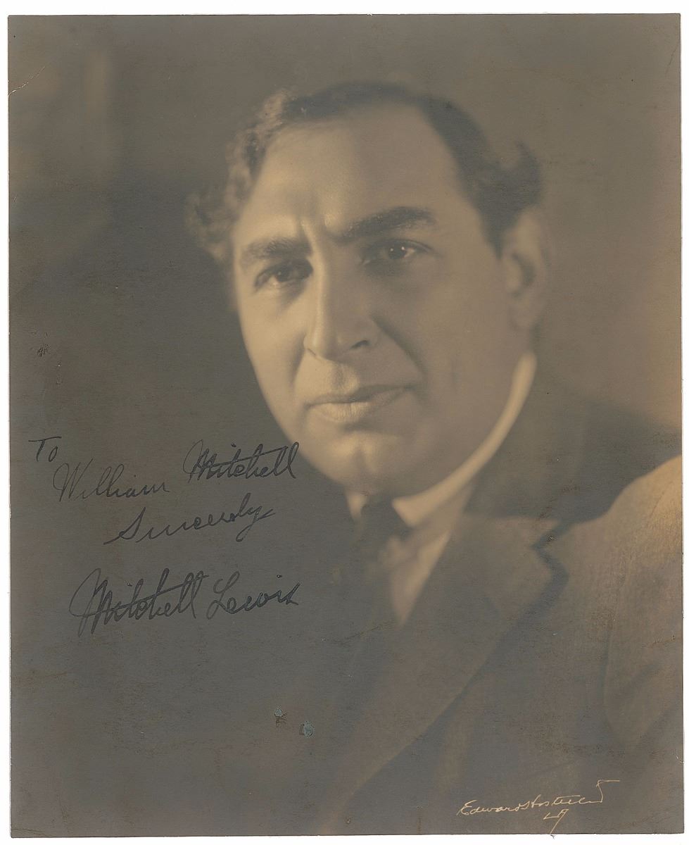Actor whose career spanned the silent and sound eras (1880–1956) whose often uncredited roles included the captain of the Winkie Guards in The Wizard of Oz; he is best known for uttering the memorable line ‘Hail to Dorothy! The Wicked Witch is dead!’ Striking matte-finish 7 x 8.5 portrait of Lewis, signed and inscribed in fountain pen, “To William Mitchell, Sincerely, Mitchell Lewis.” A crease to the upper left corner, a couple tiny filled in spots of surface loss to the lower portion of the image, and trimmed edges, otherwise fine condition; overall a highly appealing example. An extremely scarce autograph, this is the first we have offered in any format.