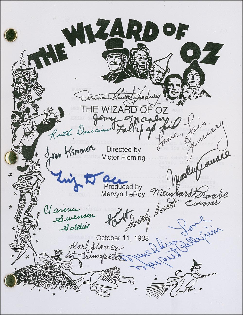 Souvenir script from The Wizard of Oz, 8.5 x 11, 113, signed on the first page in a variety of ink types and colors by thirteen different actors who portrayed various Munchkins or behind-the-scenes personalities. Signers are: Meinhardt Raabe (adding “coroner”), Mickey Carroll, Tiny Doll, Jerry Maren (adding “Lollipop Kid”), Lewis Croft, Ruth Duccini, Lois January, Margaret Pellegrini (adding “Munchkin Love”), Karl Slover (adding “1st Trumpeter”), Clarence Swenson (adding “Soldier”), Donna Stewart-Hardaway, Joan Kenmore, and Dorothy Barrett. In fine condition with three punch holes and secured at the left side with three fasteners.