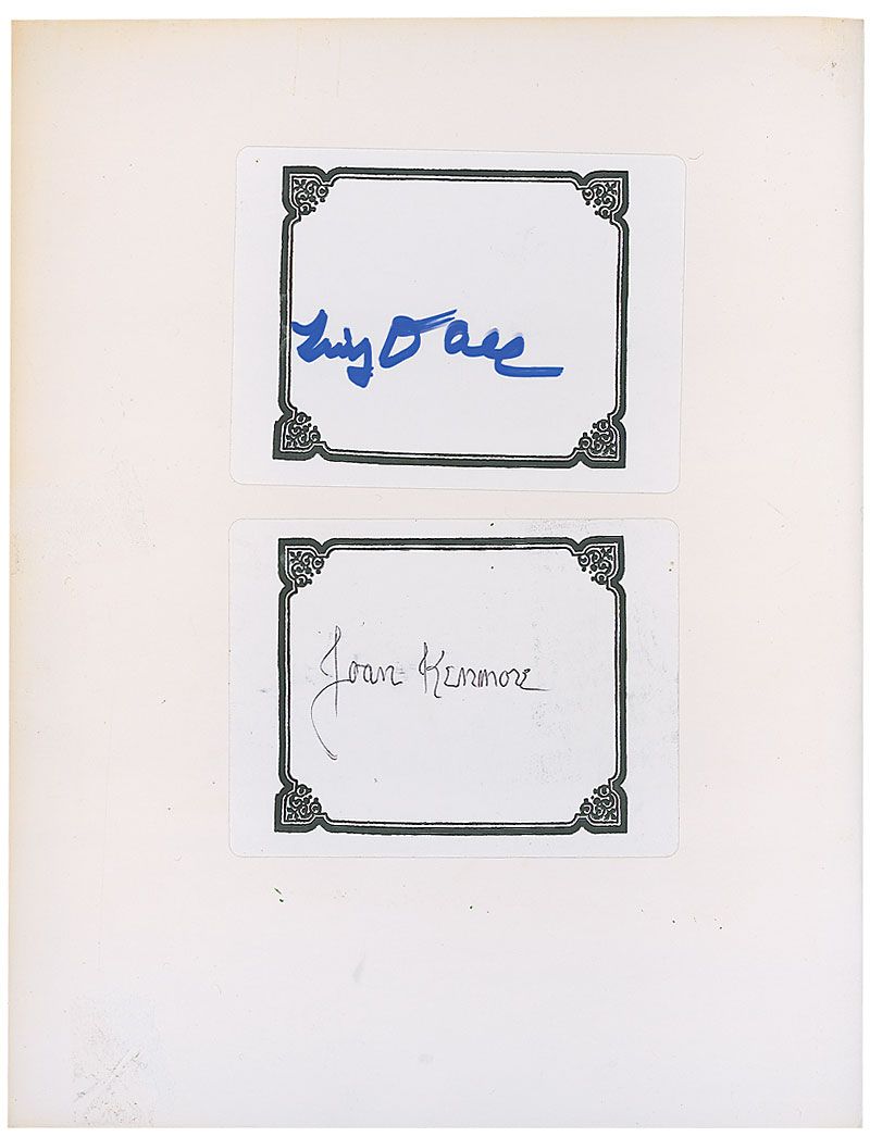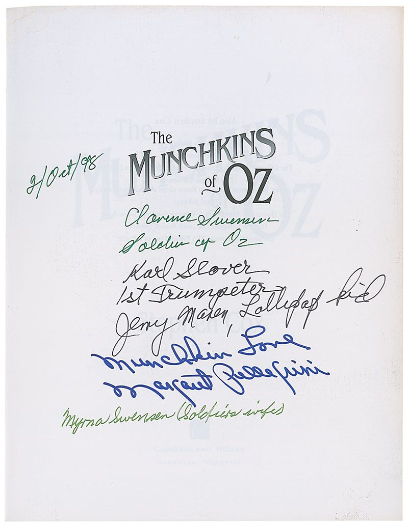 Signed book: The Munchkins of Oz. Later printing. Nashville: Cumberland House, 1996. Softcover, 8 x 10, 209 pages. Signed on the half-title page in felt tip and ink by Clarence Swensen, Karl Slover, Jerry Maren, Margaret Pellegrini, and Myrna Swensen, and signed in felt tip and ink on bookplates affixed to the inside front cover by Tiny Doll and Joan Kenmore. In fine condition, with some light handling wear and tape to inside of back cover.