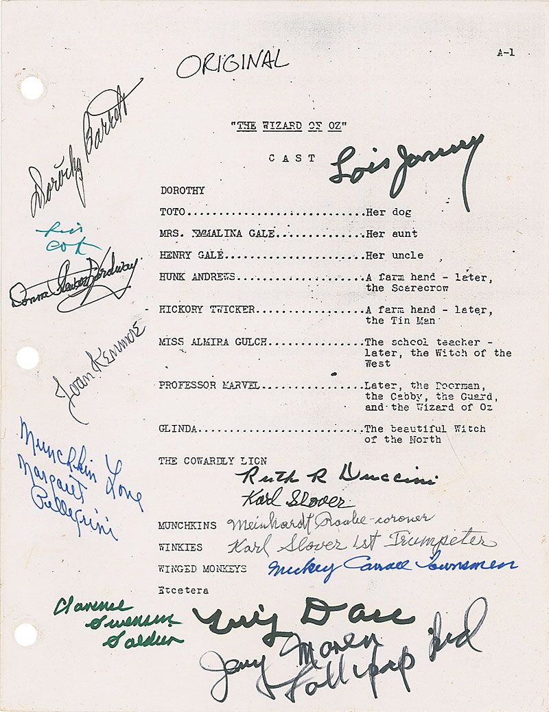 Brad-bound copy of the script for The Wizard of Oz, 8.5 x 11, 113 pages, signed on the cast page in ink and felt tip by 13 Munchkins: Lois January, Ruth Duccini, Karl Slover (2), Meinhardt Rabbe, Mickey Carroll, Tiny Doll, Jerry Maren, Clarence Swenson, Margaret Pellegrini, Joan Kenmore, Dorothy Barrett, Lewis Croft, and Donna Stewart-Hardaway, with several adding their characters as well. In fine condition.