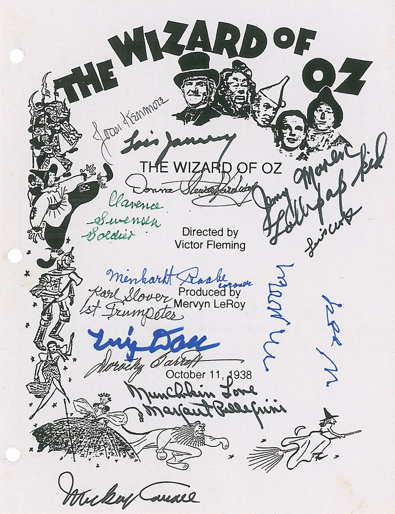 Brad-bound copy of the script for The Wizard of Oz, 8.5 x 11, 113 pages, signed on the front cover in ink and felt tip by 13 Munchkins, with several adding their characters as well. Signers are: Joan Kenmore, Lois January, Donna Stewart-Hardaway, Clarence Swensen, Meinhardt Rabbe, Karl Slover, Tiny Doll, Dorothy Barrett, Margaret Pellegrini, Mickey Carroll, Jerry Maren, Lewis Croft, and Murray Wood. In fine condition.