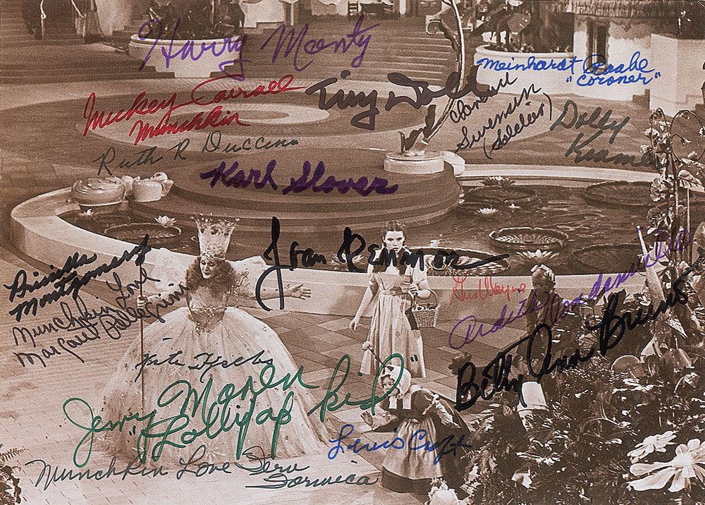 Cardstock 7 x 5 postcard photo of Dorothy in Munchkinland, signed in felt tip by 18 Munchkins. Signers are: Harry Monty, Mickey Carroll, Tiny Doll, Ruth Duccini, Karl Slover, Meinhardt Raabe, Clarence Swenson, Dolly Kramer, Priscilla Montgomery, Margaret Pellegrini, Joan Kenmore, Gus Wayne, Ardith Dondanville, Nita Krebs, Jerry Maren, Fern Formica, Lewis Croft, and Betty Ann Bruno. In fine condition.