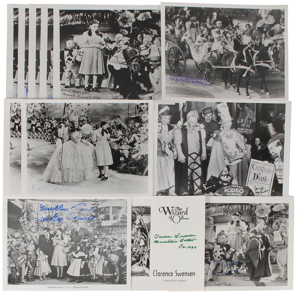 Collection of 12 cardstock and glossy photos, generally about 10 x 8, each signed by one or more of the Wizard of Oz Munchkins, including: Nel Nelson; Betty Tanner; Gus Wayne; Viola White Banks; Meinhardt Raabe and Murray Wood; Earl Slatter; Mickey Carroll; Clarence Swenson; Margaret Pellegrini; Emil Kranzler; Victor Wetter; and Jerry Maren. In overall fine condition, with smudging to Nelson’s signature and a few light creases.