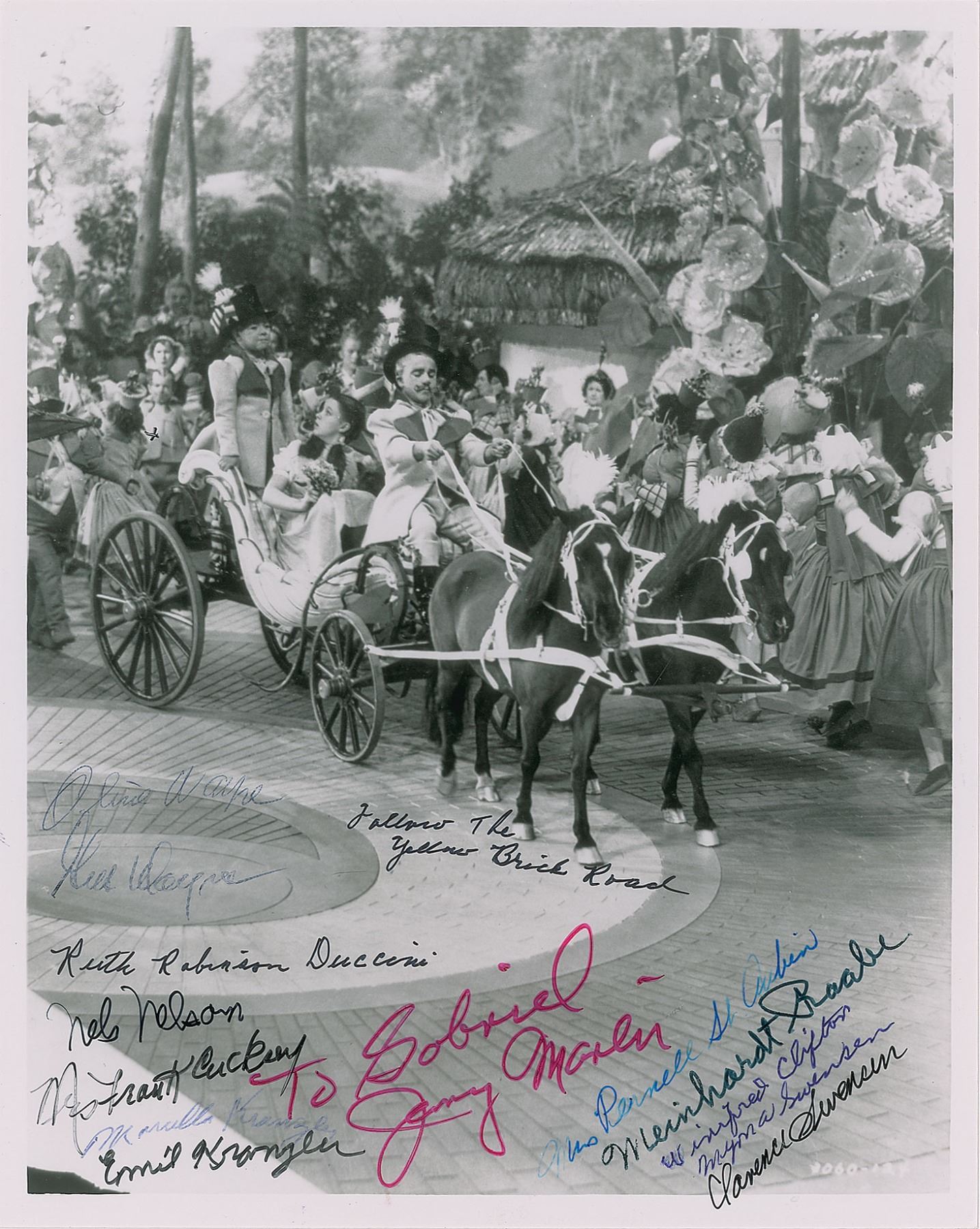 Glossy 8 x 10 photo of Dorothy being wheeled about in a horse-drawn carriage while in Munchkinland, signed in various colored ink and felt tip by 13 actors and actresses who played Munchkins in The Wizard of Oz, including: Jerry Maren (ins), Meinhardt Raabe, Clarence Swensen, Gus Wayne, Myrna Swensen, Ruth Robinson Duccini, Nels Nelson, Emil and Marcella Emil Kranzler, and more. In fine condition.