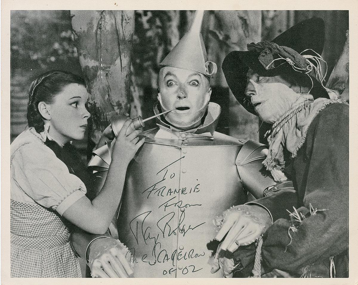 Nice 10 x 8 cardstock photo of Dorothy, the Tin Man, and the Scarecrow, signed and inscribed in black ink “To Frankie from Ray Bolger, The Scarecrow of Oz.” In fine condition, with a few small corner tip dings.