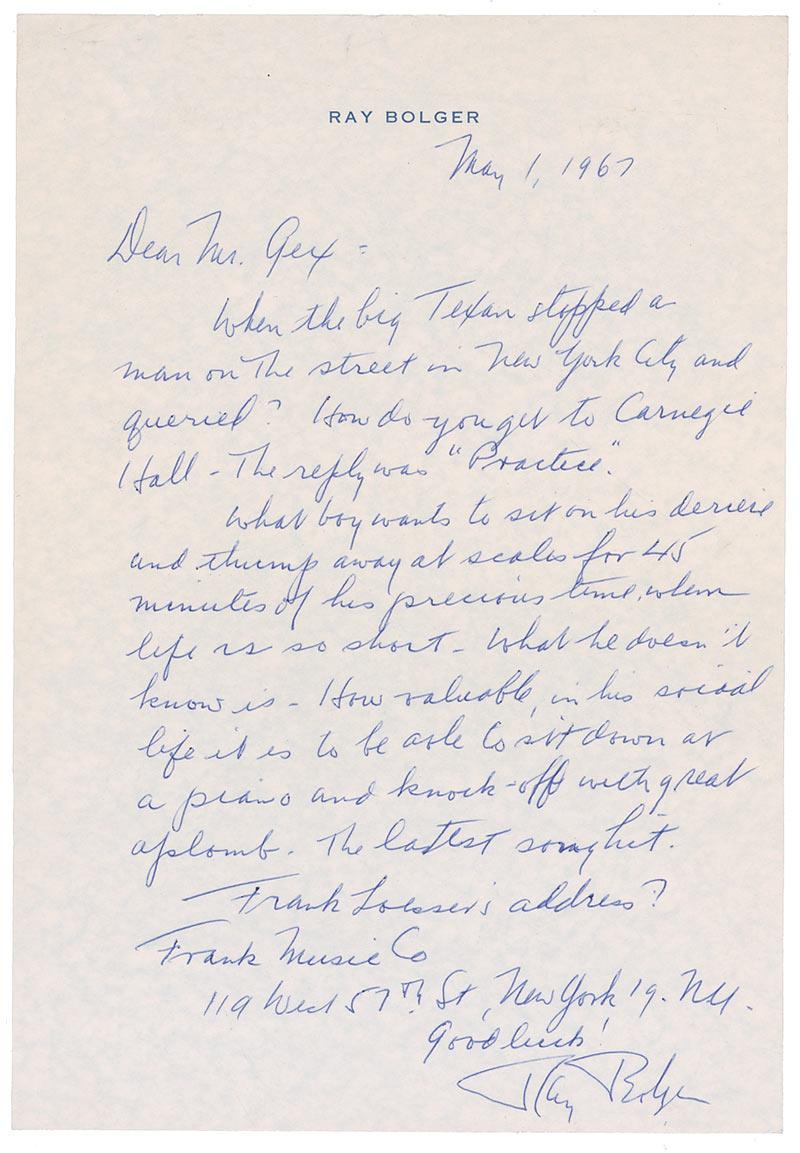 ALS signed “Ray Bolger,” one page, 7.25 x 10.5, personal letterhead, May 1, 1967. In part: “When the big Texan stopped a man on the street in New York City and queried: How do you get to Carnegie Hall—The reply was ‘Practice.’ What boy wants to sit on his derriere and thump away at scales for 45 minutes of his precious time, when life is so short. What he doesn’t know is—How valuable in his social life it is to be able to sit down at a piano and knock-off with great aplomb the latest song hit.” In fine condition, with some creasing, heavier at the top of the page. Profound wisdom from the Scarecrow of Oz.