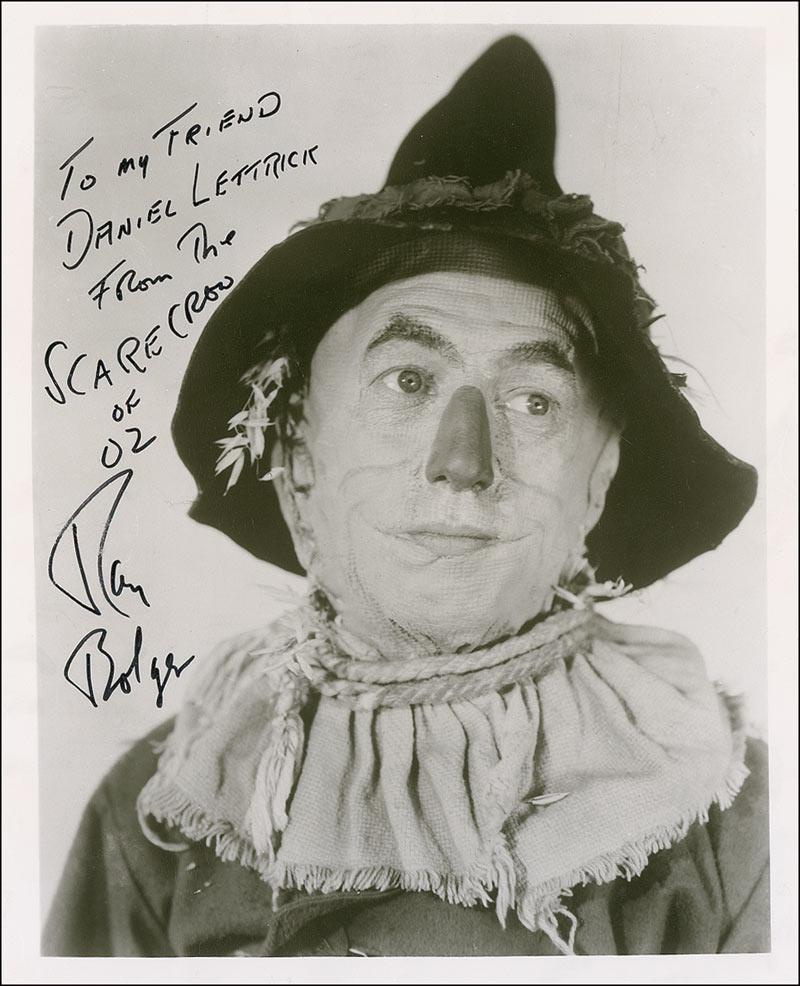 Matte-finish 8 x 10 photo of Bolger as the Scarecrow, signed and inscribed in black felt tip “To my friend Daniel Lettrick from the Scarecrow of Oz, Ray Bolger.” In fine condition, with rippling to top and bottom edges, and a light crease touching first name of signature.