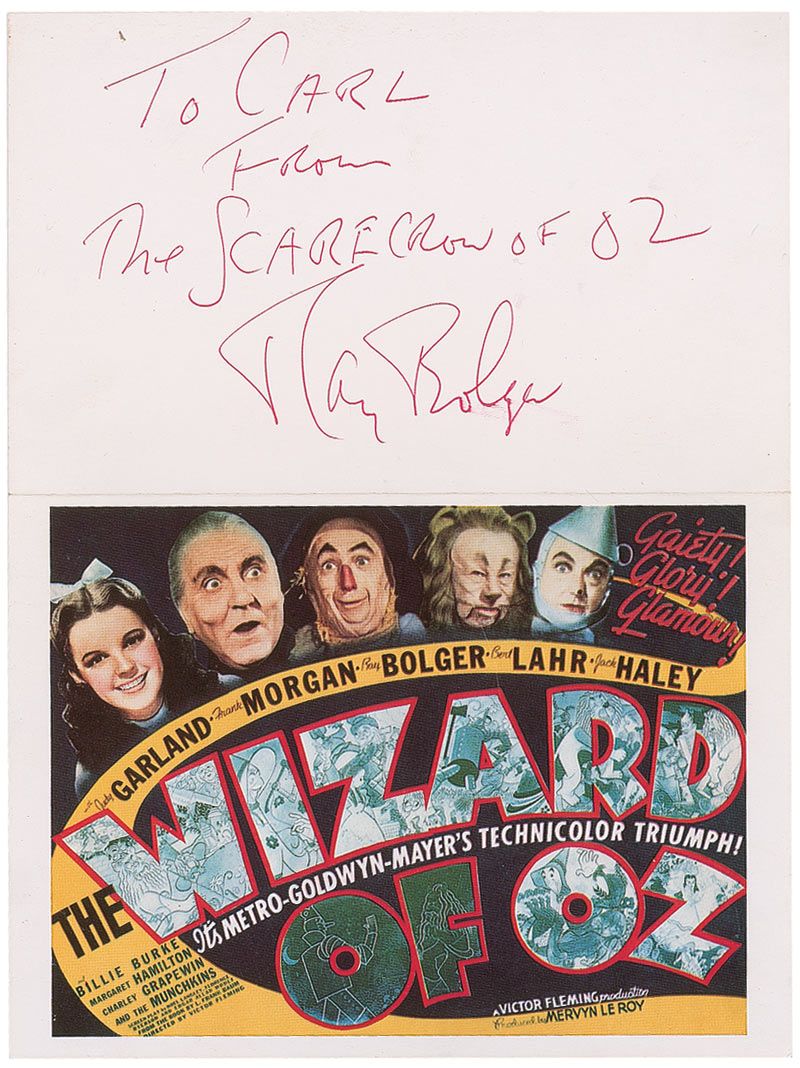 Wizard of Oz greeting card, measuring 7 x 9 opened, signed and inscribed on the back cover in red ballpoint, “To Carl from The Scarecrow of Oz, Ray Bolger.” In fine condition, with a slight brush to last name of signature.