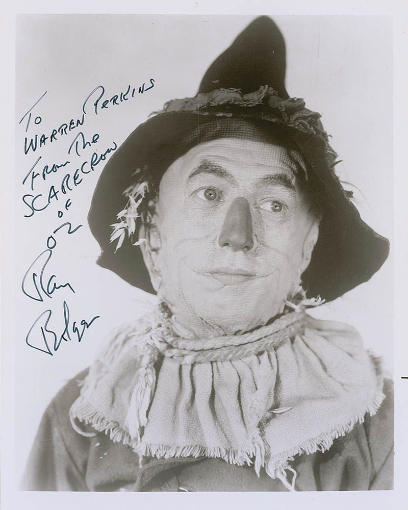 Glossy 8 x 10 head-and-shoulders photo of Bolger as the Scarecrow, signed and inscribed in black felt tip, “To Warren Perkins, from the Scarecrow of Oz, Ray Bolger.” A few light creases and a vertical streak to the finish, otherwise fine condition.