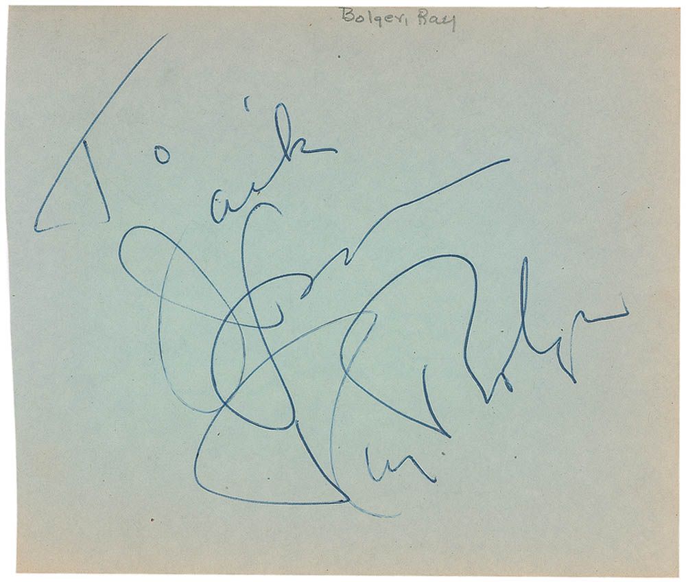 Ballpoint signature and inscription, “To Jack, from Ray Bolger,” on a light blue 5.25 x 4.5 album page with pencil collector’s notation to the top border. In fine condition, with mild toning and a trivial tear to the top edge. Accompanied by an unsigned publicity photo of Bolger in The Girl With the Flaxen Hair.