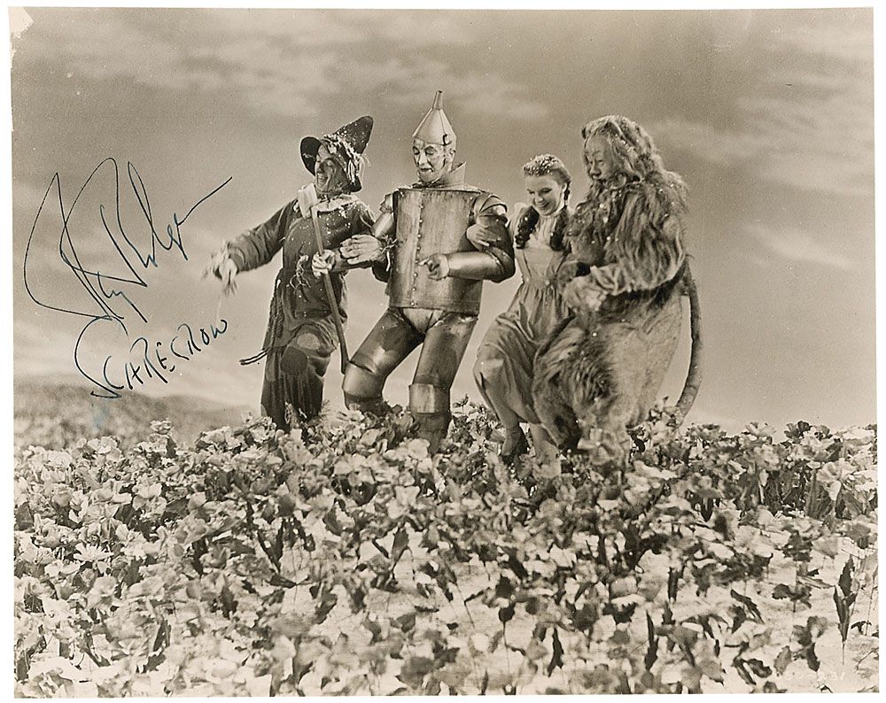 Vintage glossy 9.5 x 7.25 photo of Dorothy and her friends skipping through the poppies, signed in fountain pen, “Ray Bolger, Scarecrow.” In fine condition, with slightly trimmed edges.