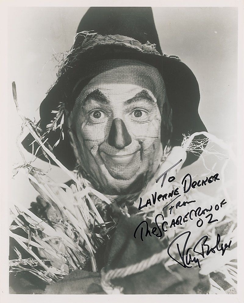 Desirable glossy 8 x 10 photo of Bolger as the Scarecrow, signed and inscribed in black felt tip, “To LaVerne Decker, From The Scarecrow of Oz, Ray Bolger.” In fine condition.
