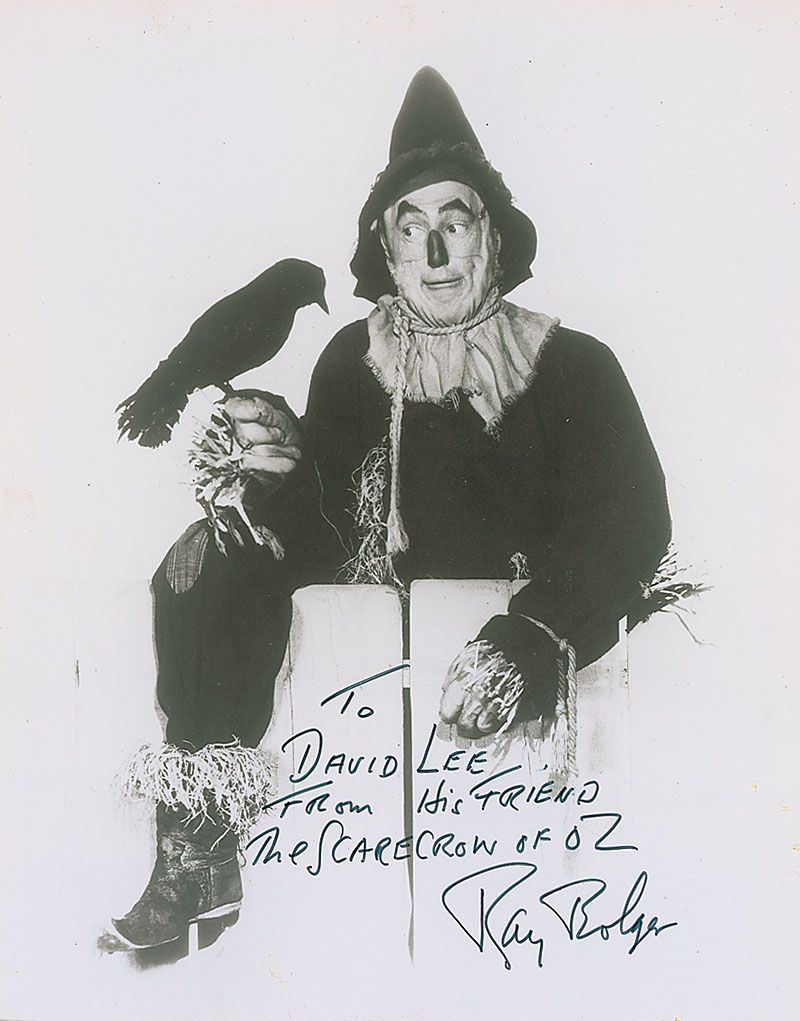 Glossy 8 x 10 photo of Bolger as the Scarecrow, signed and inscribed in black felt tip, “To David Lee, from his friend, The Scarecrow of Oz, Ray Bolger.” In fine condition.