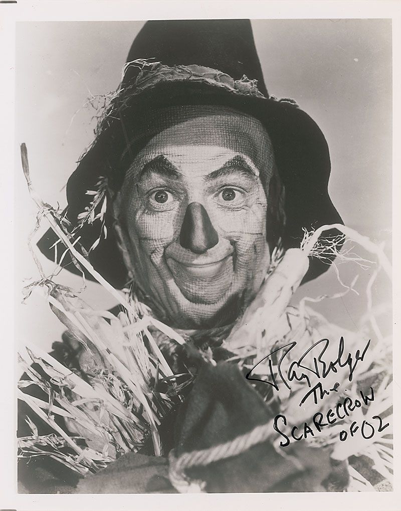 Glossy 8 x 10 photo of Bolger in costume as the Scarecrow, signed in black felt tip, “Ray Bolger, The Scarecrow of Oz.” In very fine condition. Accompanied by a certificate of authenticity from JSA.