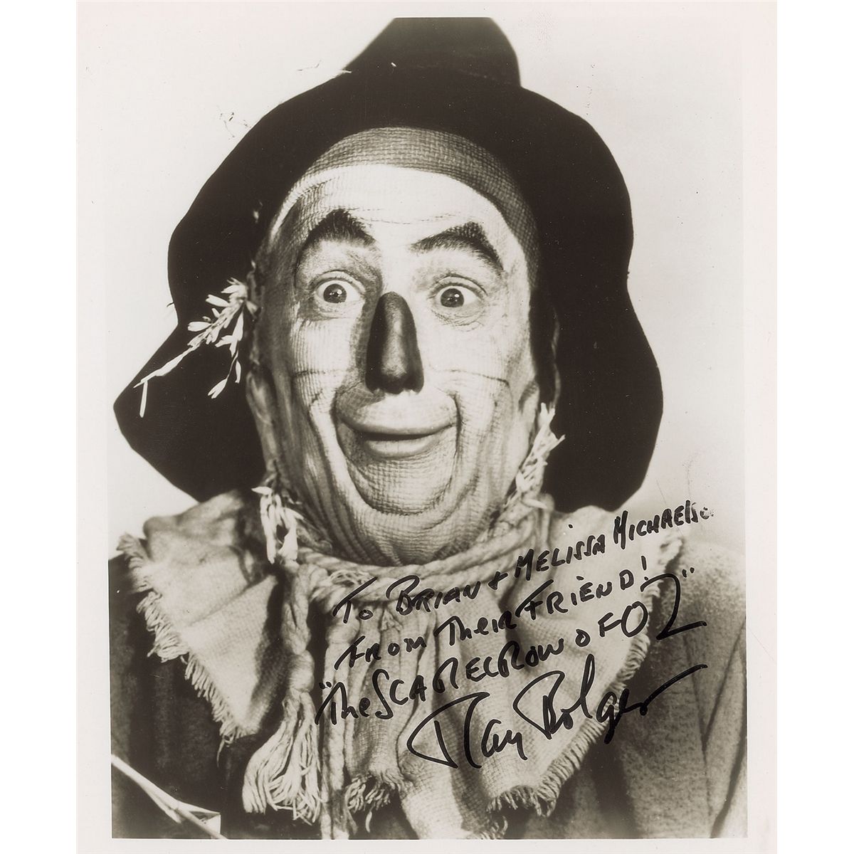Glossy 8 x 10 photo of Bolger in costume, signed and inscribed in black felt tip, “To Brian & Melissa Michaels, from their friend! ‘The Scarecrow of Oz,’ Ray Bolger.” In fine condition, with a trivial brush to the inscription.