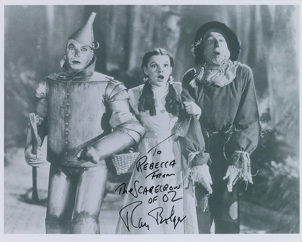 Glossy 10 x 8 photo of the Tin Man, Dorothy, and the Scarecrow in a startled pose, signed and inscribed in black felt tip, “To Rebecca, from, The Scarecrow of Oz, Ray Bolger.” In fine condition.