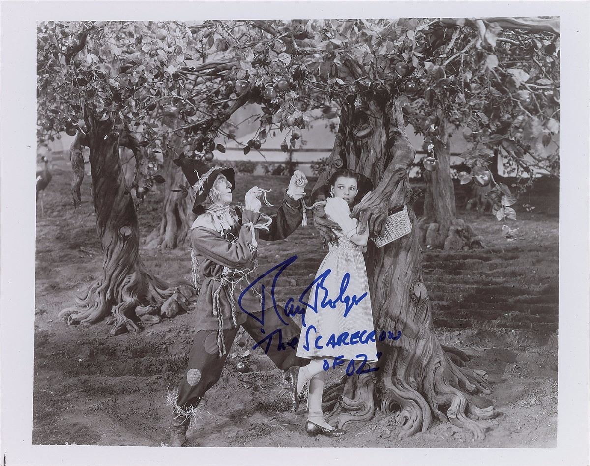 Choice uninscribed glossy 10 x 8 photo of Dorothy and the Scarecrow, signed in blue felt tip, “Ray Bolger, The Scarecrow of Oz.” In very fine condition.