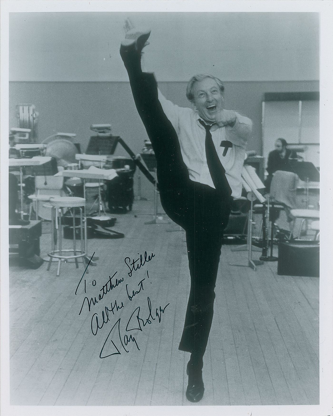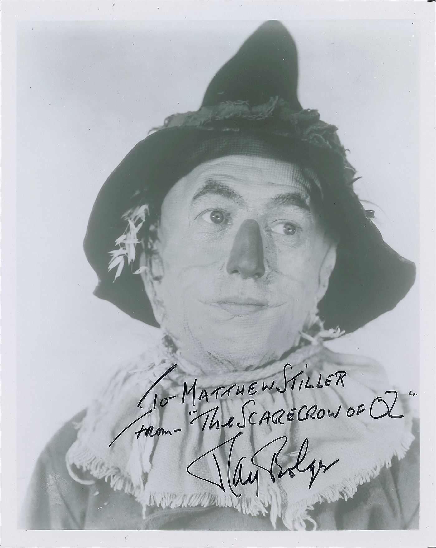 Two glossy 8 x 10 photos, one depicting Bolger as the Scarecrow from the 1939 film The Wizard of Oz, signed and inscribed in black felt tip, "To—Matthew Stiller, From—'The Scarecrow of Oz,' Ray Bolger," and the other showing Bolger doing a high kick in a music hall, signed and inscribed in black felt tip, "To Matthew Stiller, All the best! Ray Bolger." In overall very fine condition.