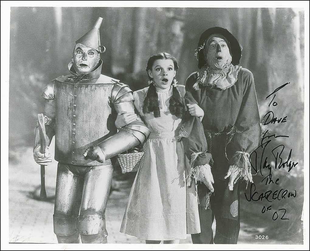 Glossy 10 x 8 photo of the Scarecrow, Dorothy, and the Tin Man on the yellow brick road, signed and inscribed in black felt tip “To Dave from Ray Bolger, The Scarecrow of Oz.” In very fine condition.