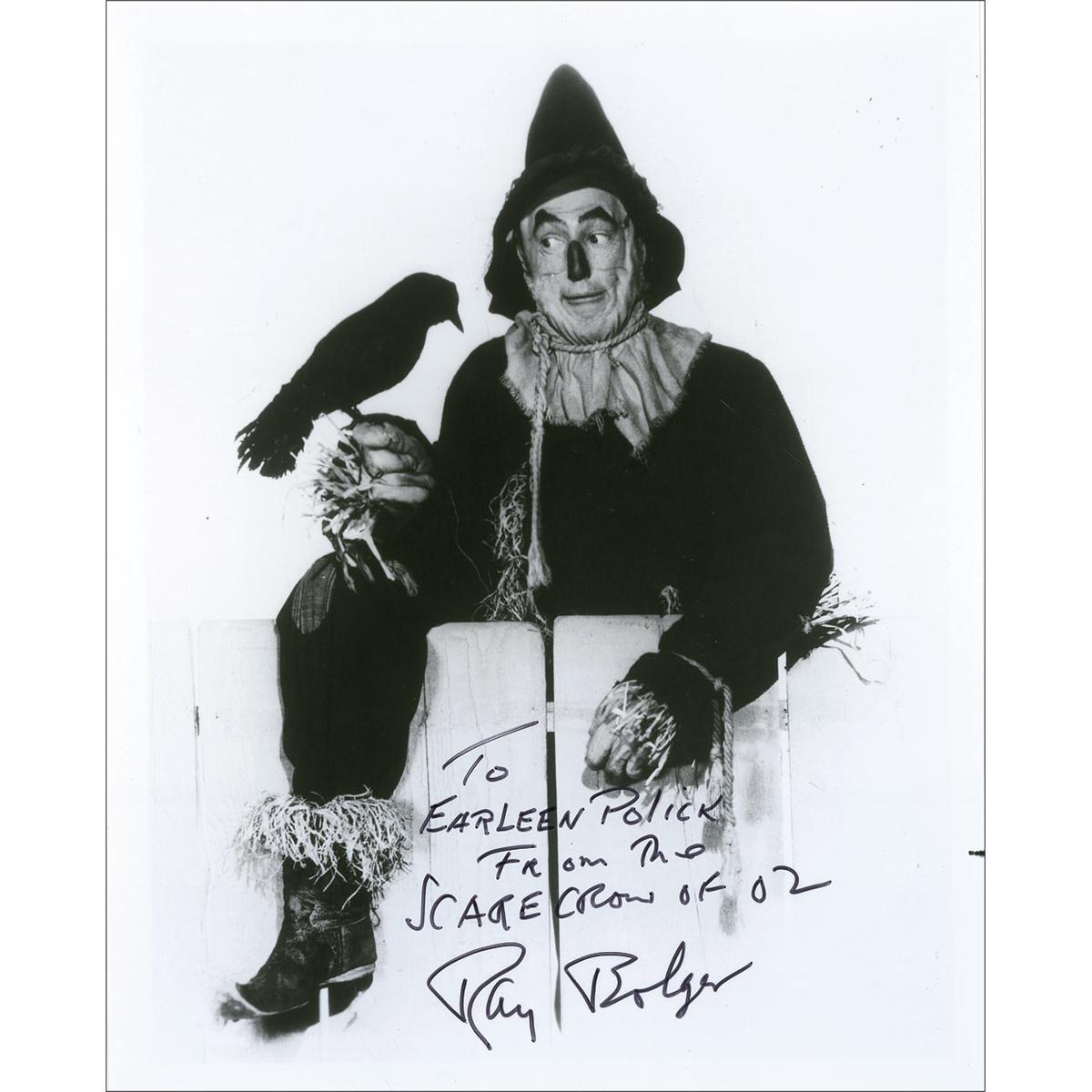 Glossy 8 x 10 photo of the Scarecrow and a feathered friend, signed and inscribed in black felt tip “To Earleen Polick from the Scarecrow of Oz, Ray Bolger.” In very fine condition.
