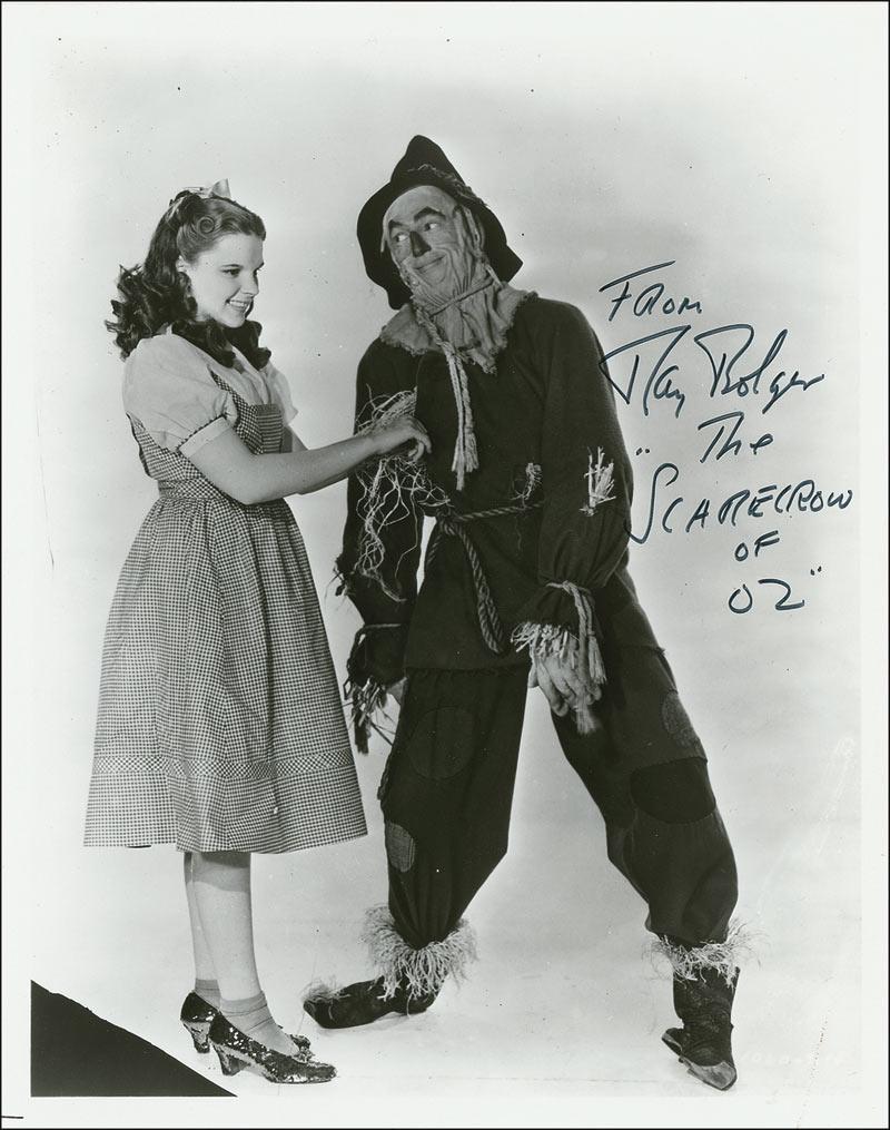Glossy 8 x 10 photo of the Scarecrow and Dorothy, signed in black felt tip, “From Ray Bolger, the ‘Scarecrow of Oz.’” In very fine condition.