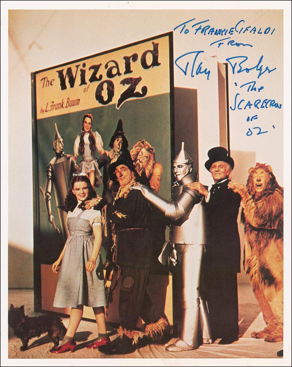 Color matte-finish 8 x 10 photo of the Wizard, Tin Man, Cowardly Lion, Scarecrow, Dorothy, and Toto beside an oversized version of the L. Frank Baum book, signed and inscribed in blue felt tip “To Frankie Cifaldi, From Ray Bolger ‘The Scarecrow of Oz.’” In fine condition, with three small binder dings along the left edge.